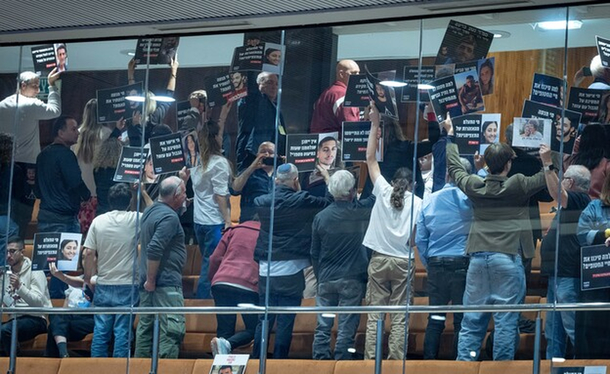 Представители левых организаций выразили протест против одобрения законопроекта. Присутствовавшие на трибунах парламента активисты встали в момент голосовании и повернулись спиной к депутатам Кнессета. Среди участников акции протеста были родственники погибших и заложников.